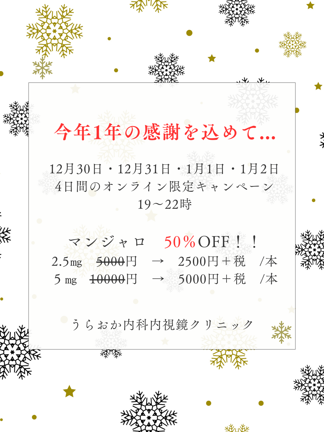 今年も一年ありがとうございました!!当院から感謝の気持ちを込めて、12月30日~1月2日の19時~22時オンライン限定で、マンジャロ半額キャンペーンを行います。前回も非常に好評だった企画ですので、ご希望の方はお早めにご予約下さい。