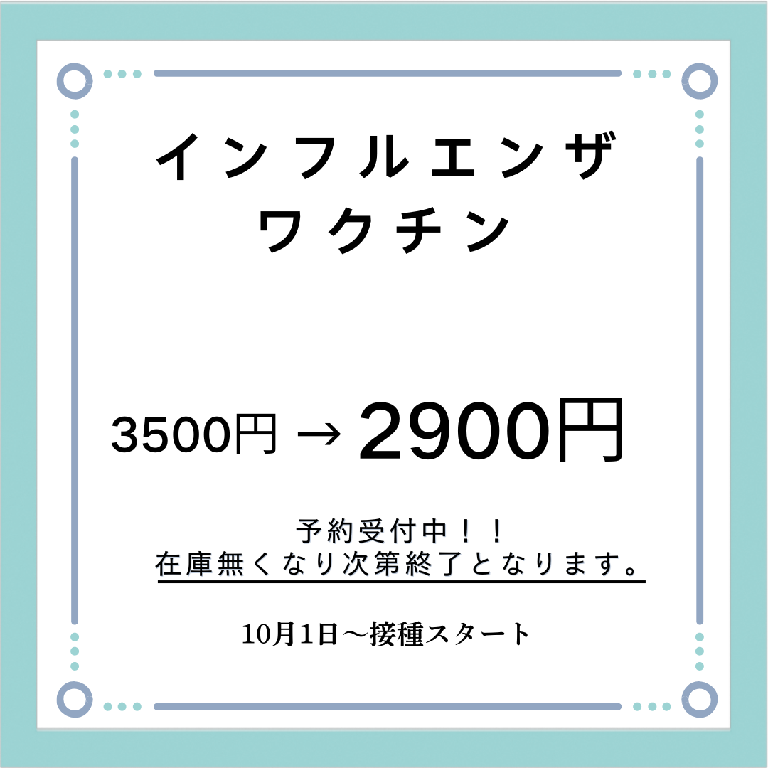 当院では1回2900円でインフルエンザワクチン接種を行っておりますので是非ご利用ください。